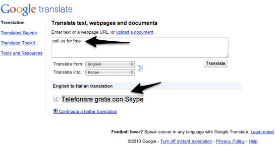 הבלוג TechCrunch מדווח על טעות תרגום של Google Translate: את המשפט "call us for free" ("התקשרו אלינו בחינם") הוא מתרגם לאיטלקית כ"Telefonare gratis con Skype", שפירושו "להתקשר בחינם עם סקייפ".