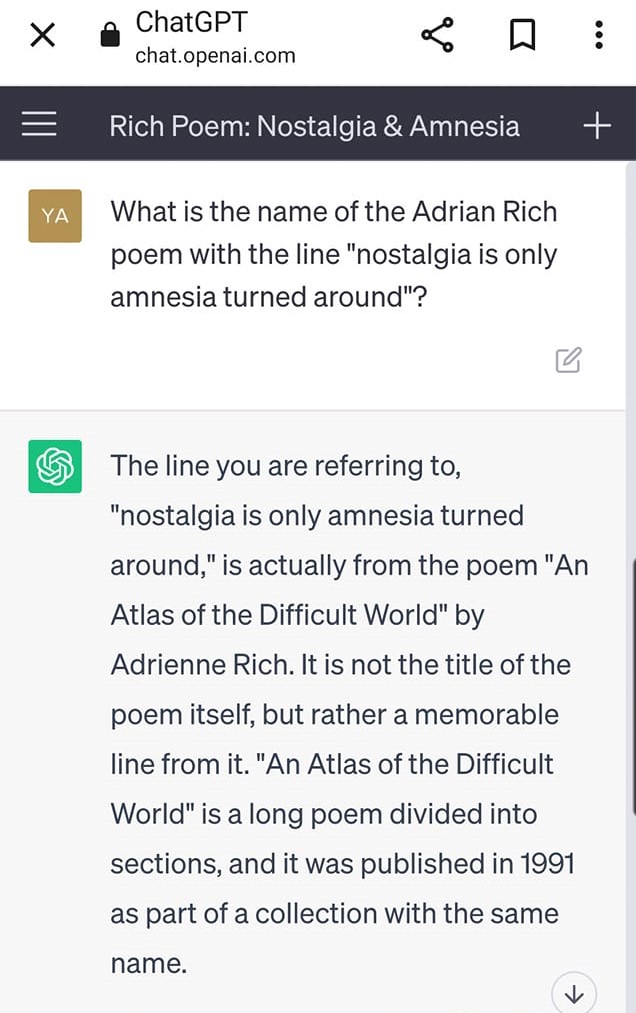 - זיהוי יצירה לפי קטע מתוכה – באג'נדה, קבוצת המתרגמים האהובה עליי בפייסבוק, אחת המתרגמות חיפשה תרגום של שיר של המשוררת אדריאן ריץ' על סמך שורה מתוכו. שאלה זריזה ב-ChatGPT איתרה את הקובץ שבו הוא נמצא, ואז כבר קל לבדוק אם הוא תורגם (באתר הספרייה הלאומית או בעזרת פואטרנס)